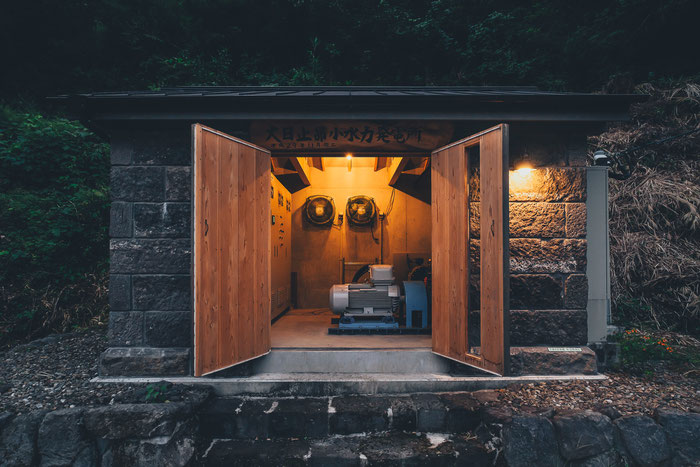 小水力発電のコンサルティングや実装を行うリバー・ヴィレッジ社から、地域のシンボルとなる建築としたい、日之影町で昔から使われてきた地場産石材を使いたい、という要望を受けて、地域に現存する石蔵を小水力発電所小屋として再解釈をするデザインとした。石材は、かつて石蔵として使われ現在は廃材となっていたものを収集し、再利用した。石壁より上部は県産木材を活用した。土木・建築の施工は、現場にほど近い位置に会社を構える吉野建設に担当して頂いた。階段は、施主を含む関係者の手作りで仕上げた。
